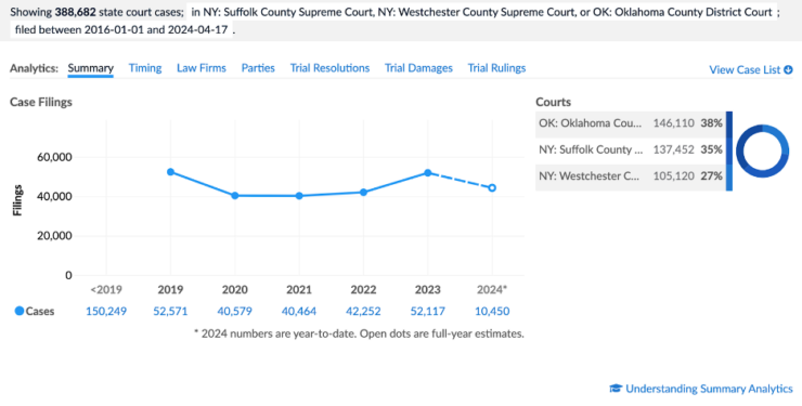 Valuable New Tranche of Corporate Litigation. The reached the 100 state court mark recently with the addition of litigation analytics for Suffolk County Supreme Court and Westchester County Supreme Court (the “New York Courts”) and Oklahoma County District Court (the “Oklahoma Court”). They previously launched the five counties within the boundaries of New York City (New York, Kings, Queens, Richmond and the Bronx) in 2020. As a former New Yorker I am astonished that it took four years to reach these two suburban boroughs. These counties are home to some major corporate players. Westchester is home to companies much as Mastercard, Pepsi, IBM and Regeneron. Suffolk is home to the likes of Canon USA, Estee Lauder, Lenovo and Nikon USA – not to mention the Hampton’s “gold coast.” This is a valuable new data tranche.