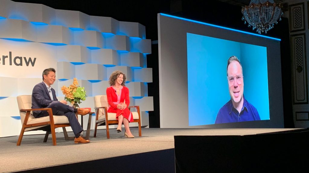 A virtual Kevin Roose, tech columnist for The New York Times, is interviewed by Alex Su, chief revenue officer at Latitude, and Rachel Gonzalez, director of customer marketing at Everlaw.