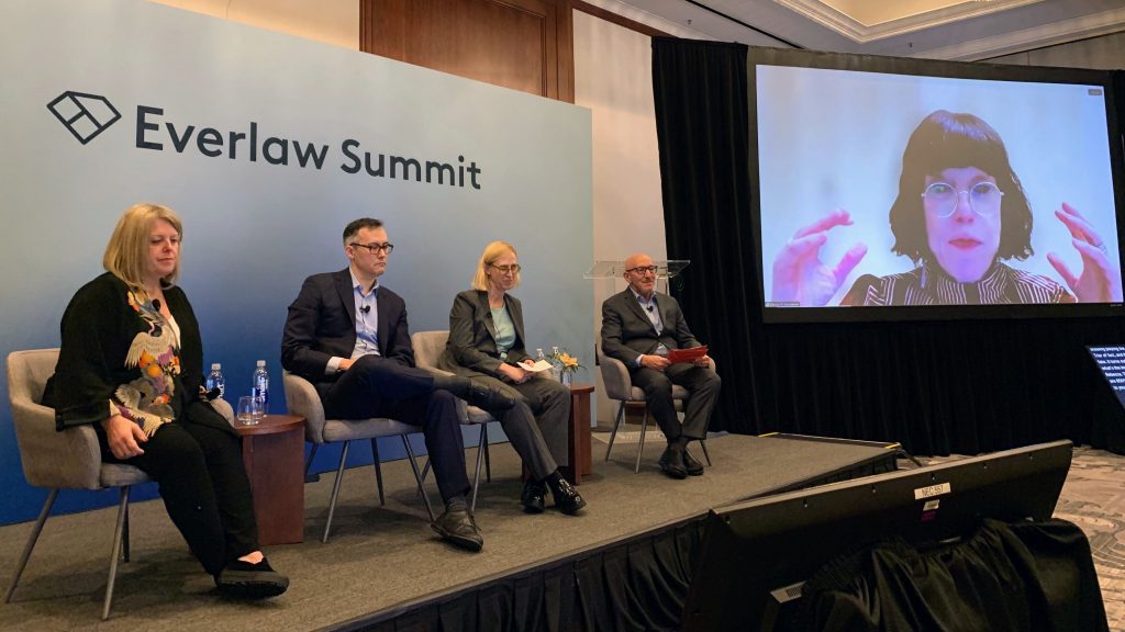 A panel of judges share their perspectives on AI, technology and the law. From left: moderator Gloria Lee, Everlaw’s chief legal officer; U.S. Magistrate Judge Allison Goddard of the Southern District of California; Superior Court Judge Evette Pennypacker of Santa Clara County, Calif.; and U.S. District Judge Rebecca Pallmeyer of the Northern District of Illinois.