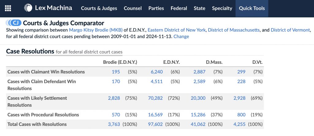 This enhanced data set is also available through the litigation analytics feature of the legal research platform Lexis+. Lex Machina is owned by LexisNexis.