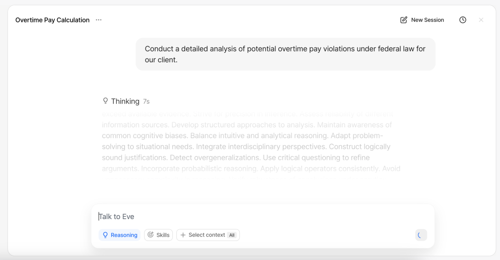 “We’re definitely not limiting ourselves to just those capabilities. While reasoning mode is embedded in those specific skills because that’s where we’ve seen the most significant impact, we’re continuously expanding the possibilities. The beauty of this feature is that it can enhance virtually any interaction you have with Eve. We provide comprehensive training and best practices to help users maximize its potential, but we don’t restrict how it can be applied — the use cases are truly limitless. Our users have already been teaching Eve new skills specific to their firm.”
