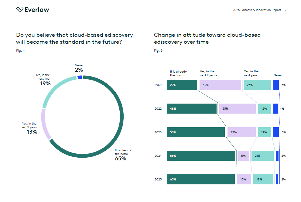 With regard to cloud adoption, the study shows continued growth, with 66% of respondents now using cloud-based e-discovery software, including 40% managing their cloud deployments in-house – a 5% increase from the previous year.