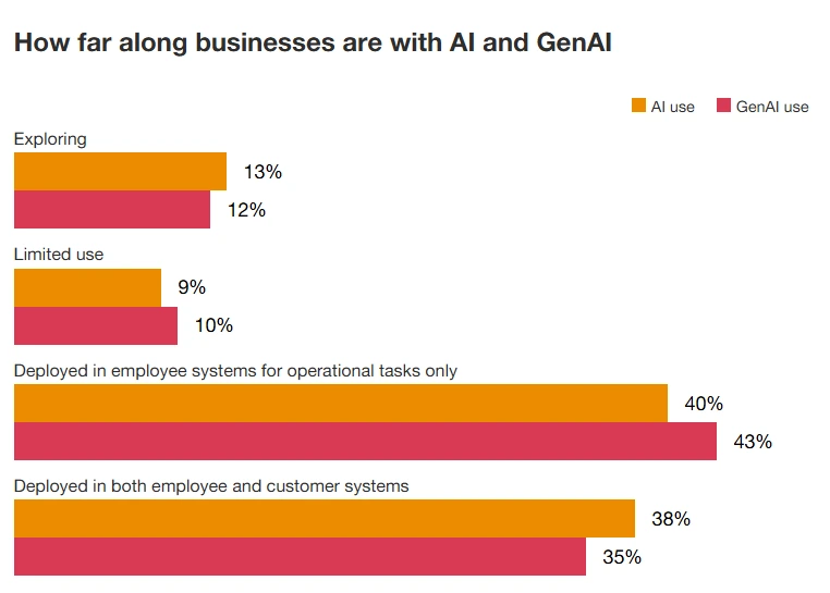 PwC research shows how quickly organizations are advancing with AI. Only a small share of organizations remains in the exploratory stage, while more than three-quarters already have AI embedded in employee systems or in both employee and client-facing processes. Within that group, 43% are using Generative AI (GenAI) for operational tasks, while 35% have extended it into customer interactions.