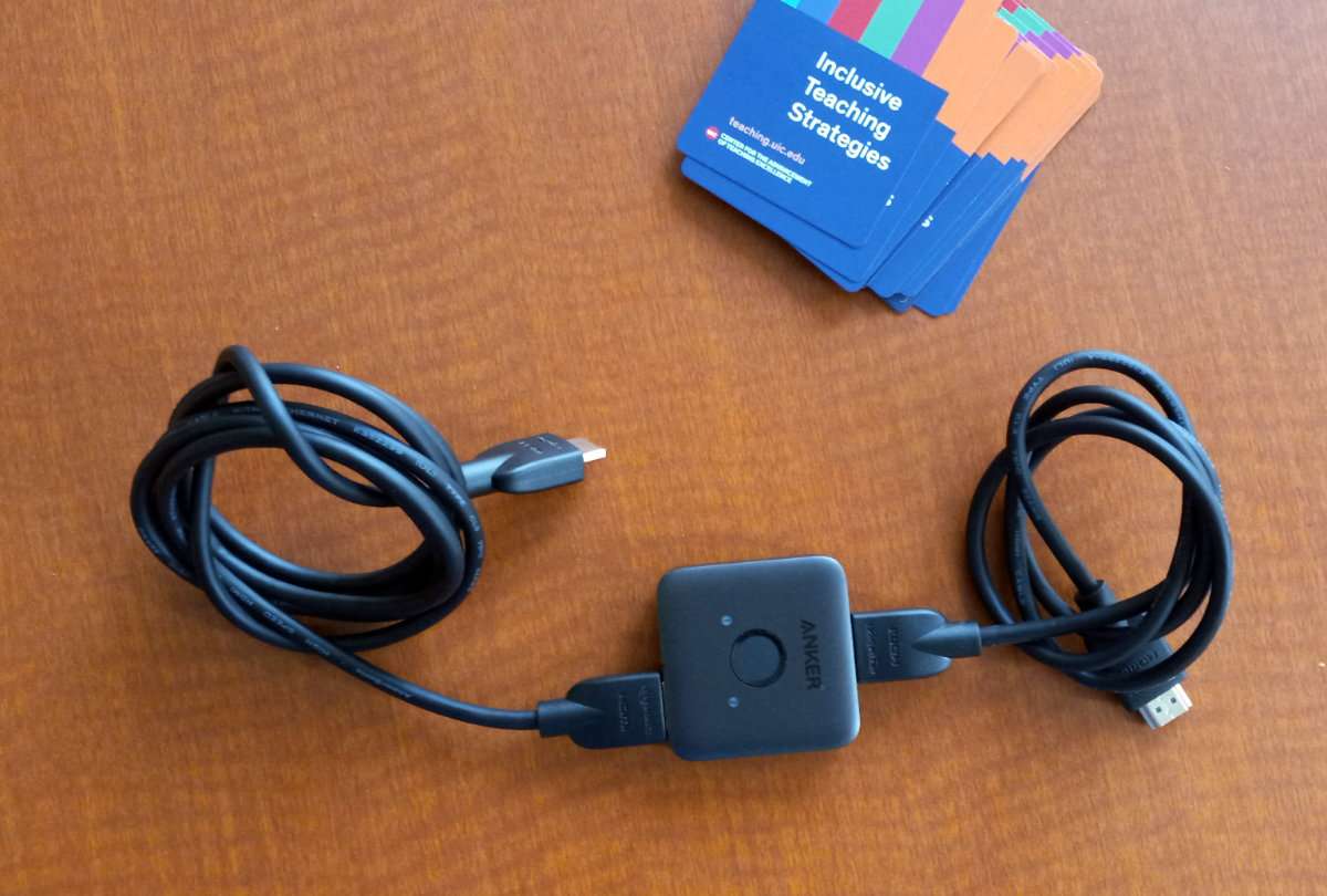 The legal research classroom did not have a spare HDMI cable like the essay writing class. It did, however, have an exposed HDMI port in the wall where the podium screen connected to the projector. To enable my use of my work laptop, I used an Anker HDMI splitter ($13 on Amazon) with a spare HDMI cable.