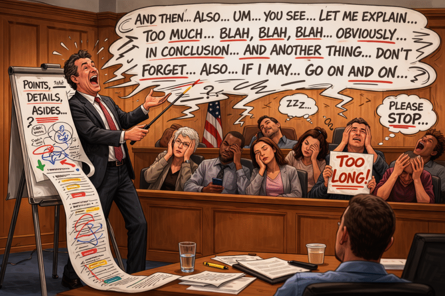 As lawyers, we often get hung up with minutiae. We lose respect for the jury and their time. The result is we try to prove the same point over and over. We fear when we make a point, some of the jurors don’t get it. So, we make it again and again. We argue minor points to the judge at bench conferences as the jury looks on bored to tears.