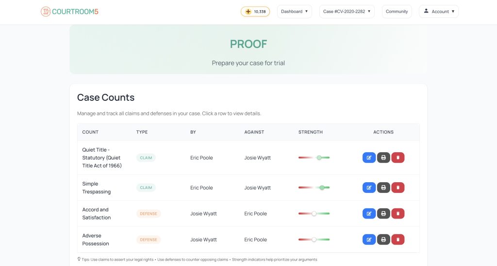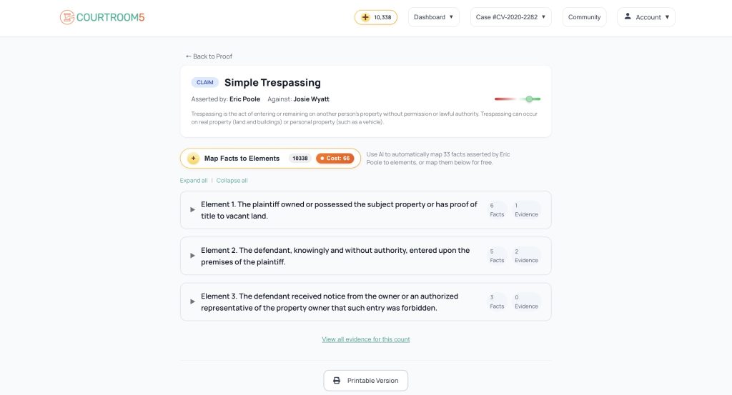 Proof helps users translate their narrative — their story of what happened — into the structural hierarchy of a legal case: claims or defenses, the legal elements of each, the facts supporting those elements, and the evidence proving or disproving those facts.