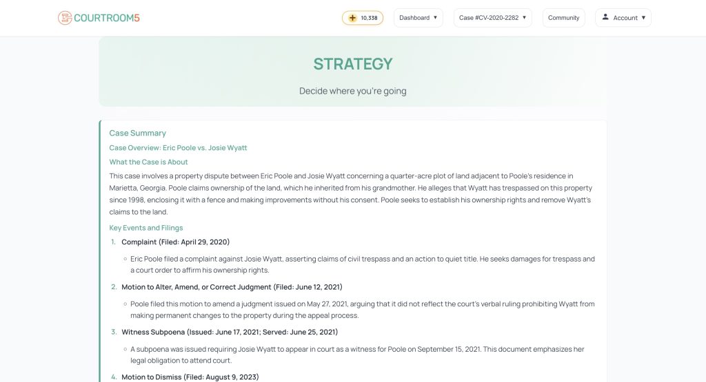 Strategy maintains a running record of the case. Users upload the court filings, and every uploaded filing gets summarized in plain language and stored in a chronological case record.