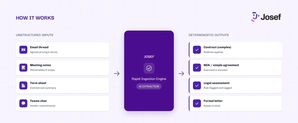 Josef, the Australia-based legal automation platform, has launched a new capability it is calling the Rapid Ingestion Engine, which uses AI to convert unstructured business inputs — such as email threads, meeting notes and term sheets — into the structured data that legal workflow templates require.