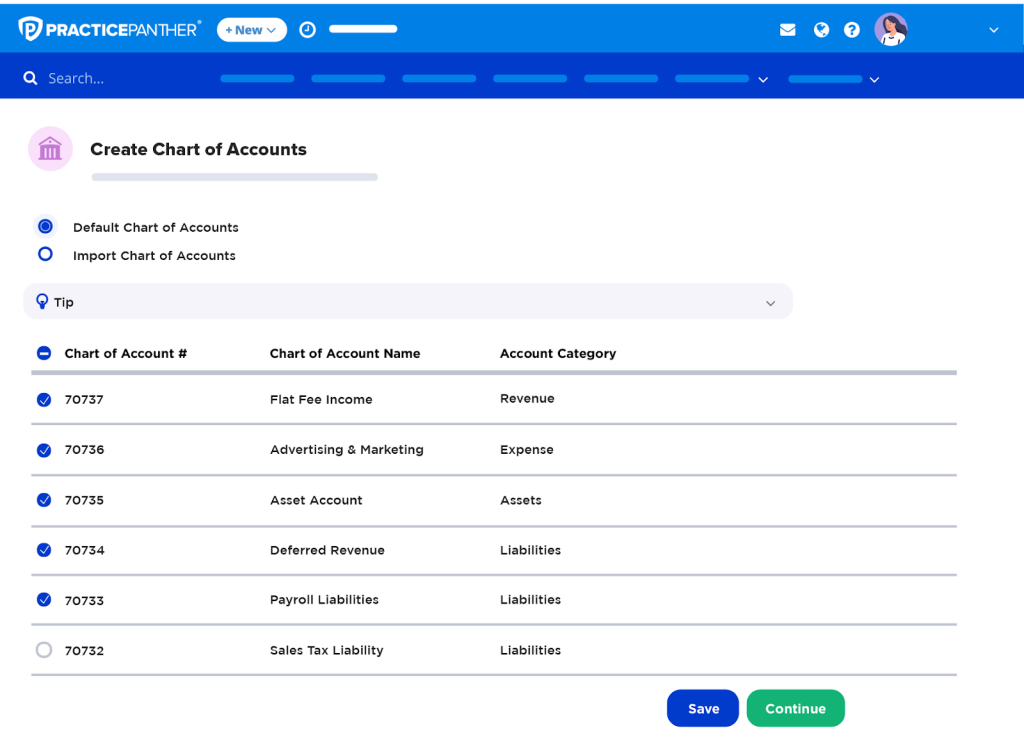 For operating accounts, the onboarding follows the same workflow, with one addition, which is setting up a chart of accounts. PracticePanther provides a default chart of accounts tailored to law firms, built from data gathered from thousands of firms. Firms can also import their existing chart of accounts or customize the defaults, toggling categories on and off before importing.