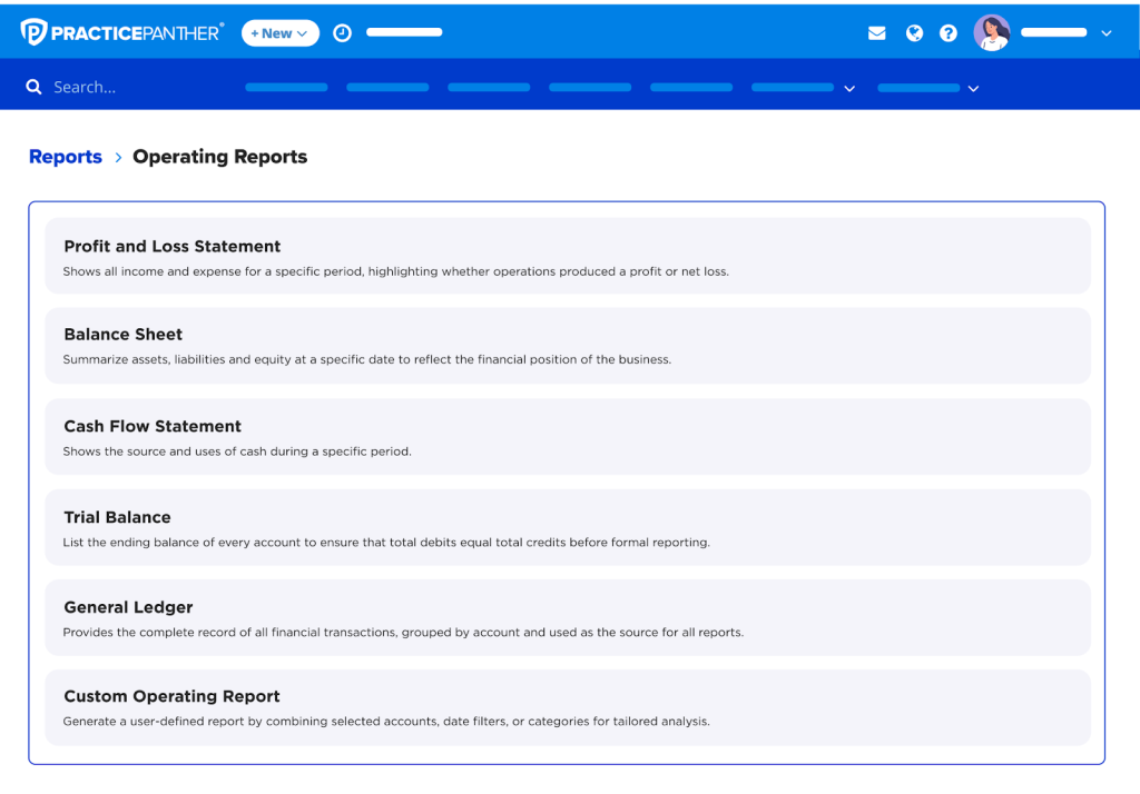 PantherAccounting Plus includes granular, role-based permissions that extend PracticePanther’s existing security controls. Administrators can control who can view specific reports (such as P&L statements or balance sheets), who can perform reconciliations, and for which accounts.