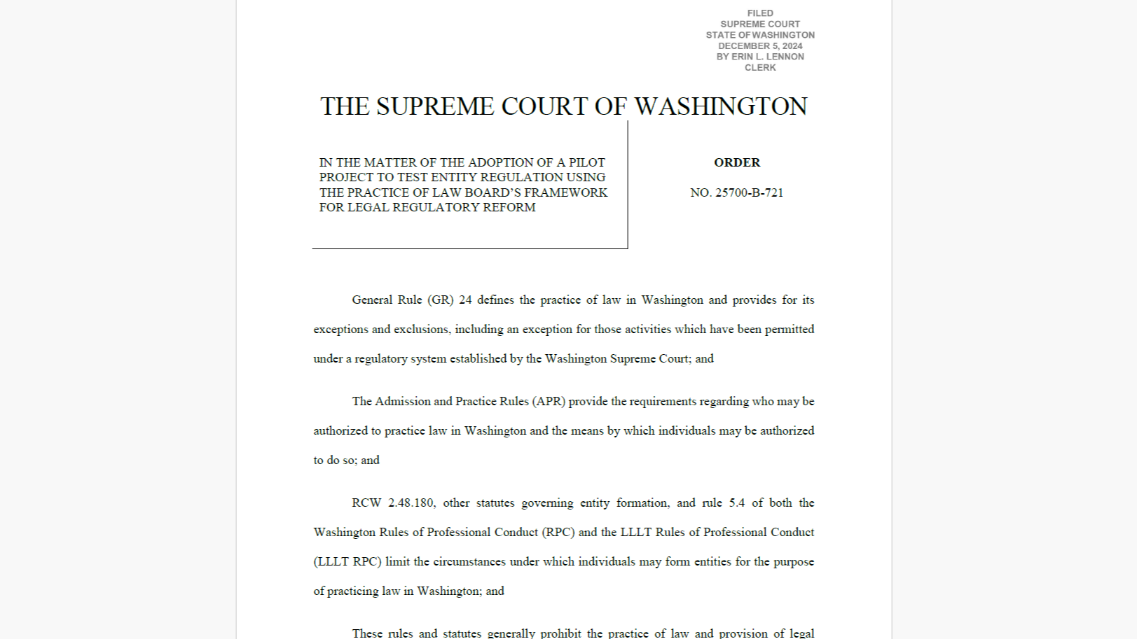 On Dec. 5, in a move to enhance access to justice, the Supreme Court of the state of Washington issued a historic order authorizing a regulatory reform pilot program by which entities not owned by lawyers will be able to deliver legal services. The move makes Washington only the third state, after Utah and Arizona, to approve a comprehensive change